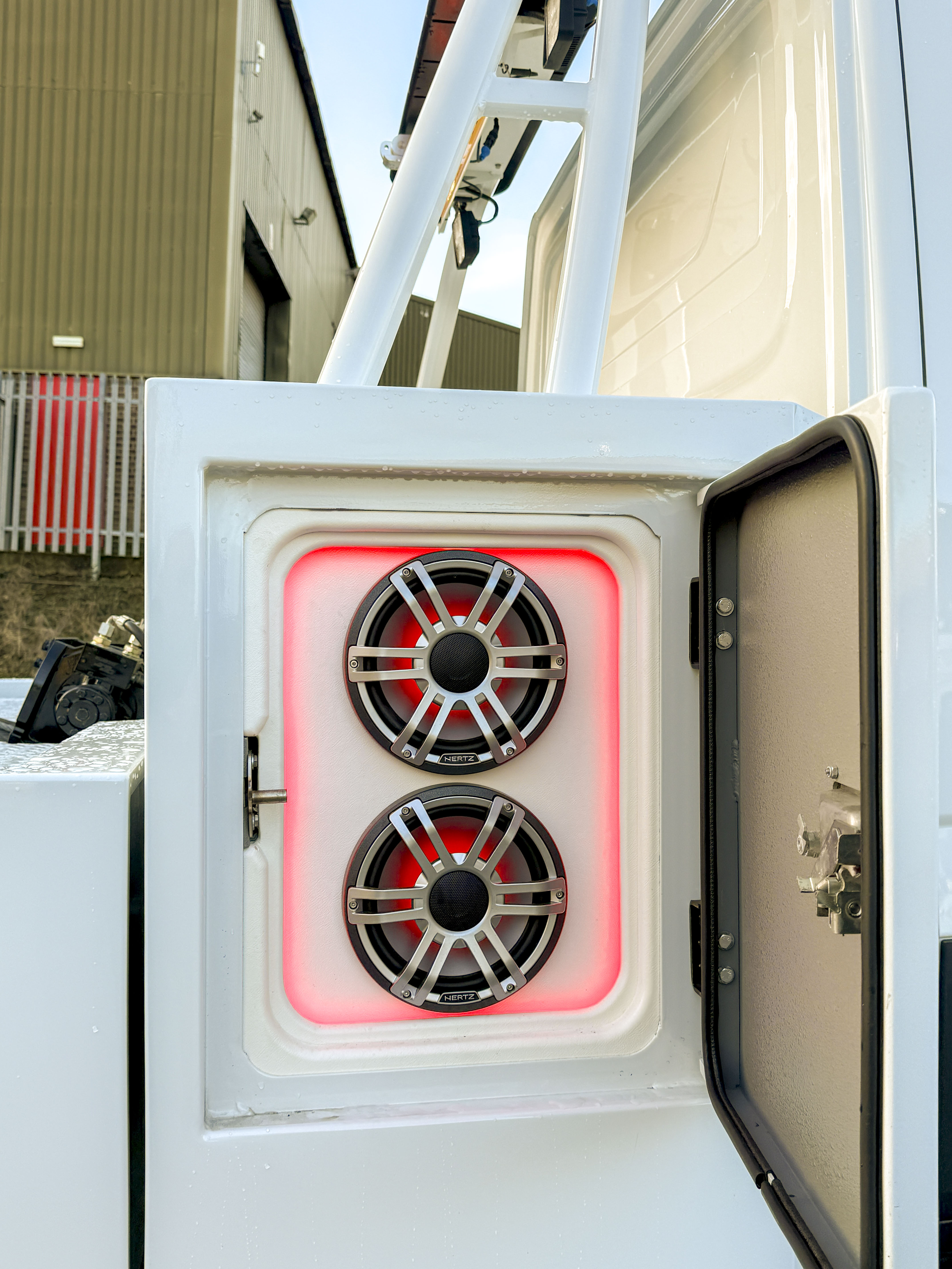 The vehicle's stereo has been upgraded by Trucking Sounds with speakers in the offside lockers and under the rear seats.